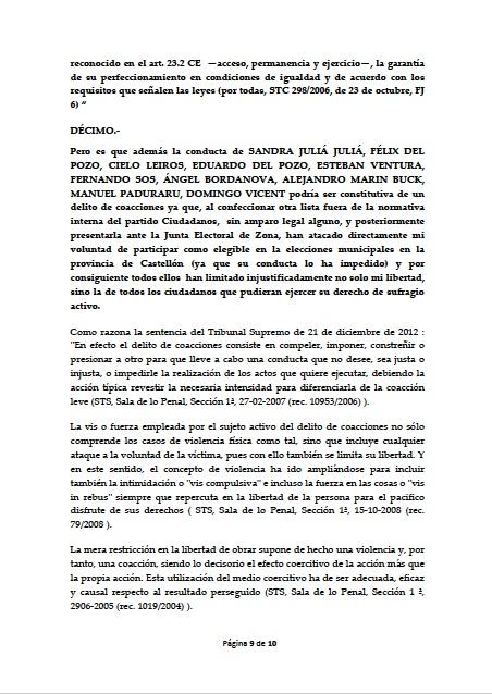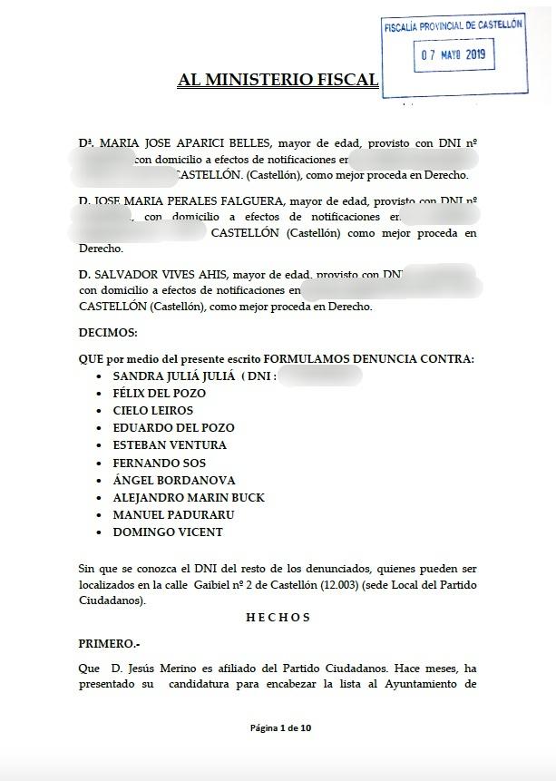 Tal como amenazaron en su momento allegados a Jesús Merino, esta mañana se presentaba la querella, que solicita, entre otras cosas, la impugnación de esa candidatura de Ciudadanos al Ayuntamiento de Castellón. Pero es más, la querella solicita responsabilidades penales contra: Sandra Julià, Félix del Pozo, Cielo Leirós, Eduardo del Pozo, Esteban Ventura, Fernando Sos, Ángel Bordanova, Alejandro Marín Buck, Manuel Paduraru y Domingo vicent.