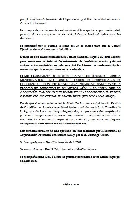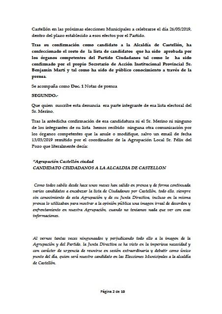 Allegados a Jesús Merino han formalizado la querella presentada en Fiscalía contra Sandra Julià y otros miembros de Ciudadanos, por 'haber alterado' la candidatura que se presentó en la Junta Electoral el 22 de abril para las elecciones del 26M en Castellón, que debía haber estado liderada por Jesús Merino y que acabó con Marín Buck como cabeza de lista. Alegan, que Merino fue elegido por los órganos directivos de Valencia y Madrid y que los de Castellón modificaron esta lista, que pretenden impugnar en el juzgado.