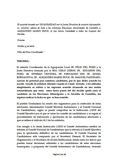 “Como todos sabéis desde hace unos meses han salido en prensa y de forma continuada varios candidatos a encabezar la lista de Ciudadanos por Castellón, todo ello, siempre sin conocimiento de esta Agrupación y de su Junta Directiva, incluso en la misma prensa lo utilizaban para mostrar a la opinión pública una imagen irreal de desorden y enfrentamiento en nuestra Agrupación, cuando no teníamos nada que ver con esas informaciones.