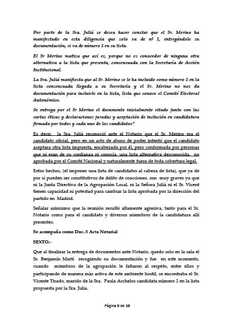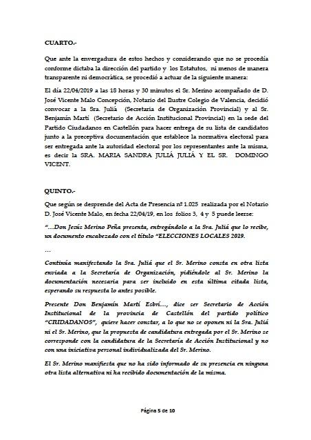 Según consta en la querella y admiten los miembros de Ciudadanos, Jesús Merino se personó en la Agrupación ‘con su lista’, que no era la misma que había elaborado el Partido en Castellón, acompañado por un notario, para que diera fe de lo que ocurría.