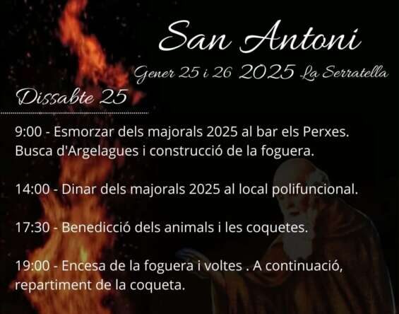 La fiesta de Sant Antoni empezará el sábado 25 con el almuerzo de los mayorales en el bar els Perxes. Al acabar, se hará la búsqueda de 'Argelagues' y se construirá la hoguera. Seguidamente, se hará la comida de los mayorales en el local polifuncional. Por la tarde, tendrá lugar la bendición de los animales y de las 'coquetes' y, al acabar, se encenderá la hoguera y se harán las típicas 'vueltas'. Para cerrar el día, se ha organizado una cena de hermandad de sobaquillo en el local polifuncional para todo el pueblo. Al finalizar la cena habrá baile.