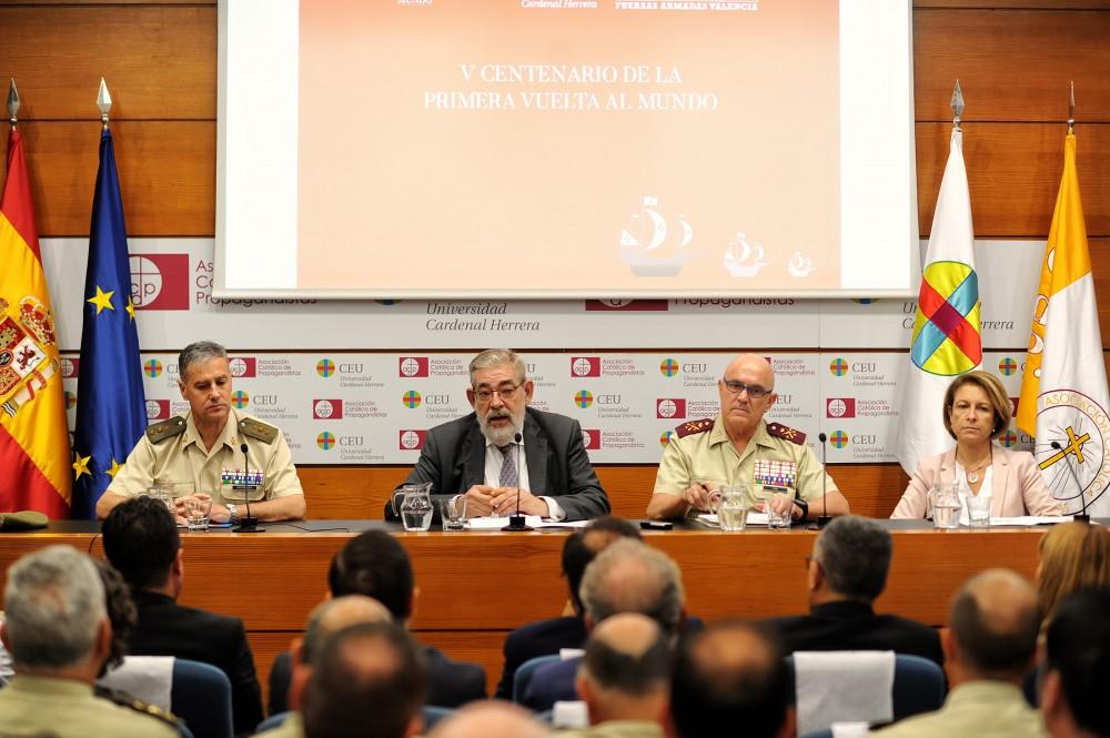 La Universidad CEU Cardenal Herrera y las FAS de Valencia han presentado esta mañana un proyecto pedagógico internacional sobre la primera vuelta al mundo de Magallanes y Elcano en el que cinco 'cuadernos de bitácora' viajarán desde centros educativos españoles a colegios de Chile, Argentina, Uruguay, Filipinas y Guinea Ecuatorial para que los escolares relaten en ellos la huella que la gesta de estos históricos navegantes dejó en sus respectivos países. Se trata de una iniciativa impulsada desde los Grados en Educación Infantil y Educación Primaria del CEU, en el que participan estudiantes y profesores de sus campus de Valencia y Castellón, que se inscribe, además, en las actividades de la Cátedra Internacional CEU Elcano en el marco de las conmemoraciones del V Centenario de esta primera circunnavegación.