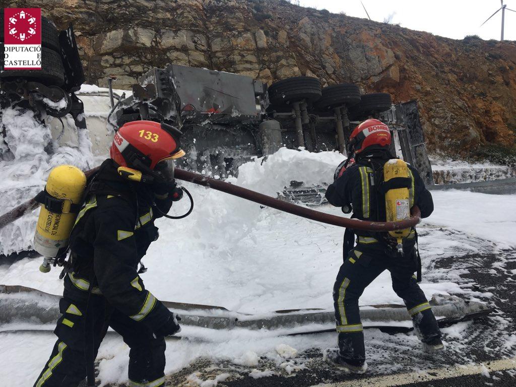 Dotaciones de los parques de Alto Palancia y Plana Baixa del CPBC se ha movilizado hasta un accidente en el que se ha visto implicado un vehículo que transportaba mercancías peligrosas ADR en Barracas.