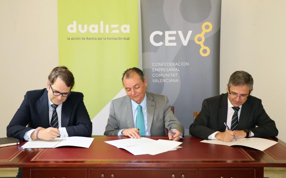 Fundación Bankia por la Formación Dual y la Confederación Empresarial de la Comunitat Valenciana (CEV) han firmado hoy un convenio para el impulso de la Formación Profesional y su modalidad dual con el objetivo de mejorar la empleabilidad de los trabajadores y las trabajadoras. Al acto de firma del acuerdo han asistido el director de Fundación Bankia por la Formación Dual, Juan Carlos Lauder, el director de Negocio de Bankia para Levante, Carlos Aguilera, el presidente de CEV, Salvador Navarro, y la presidenta de CEV Valencia, Eva Blasco, además de la presidenta de la Comisión de Formación, Educación y Gestión Conocimiento de la CEV, Leonor Sáiz.
