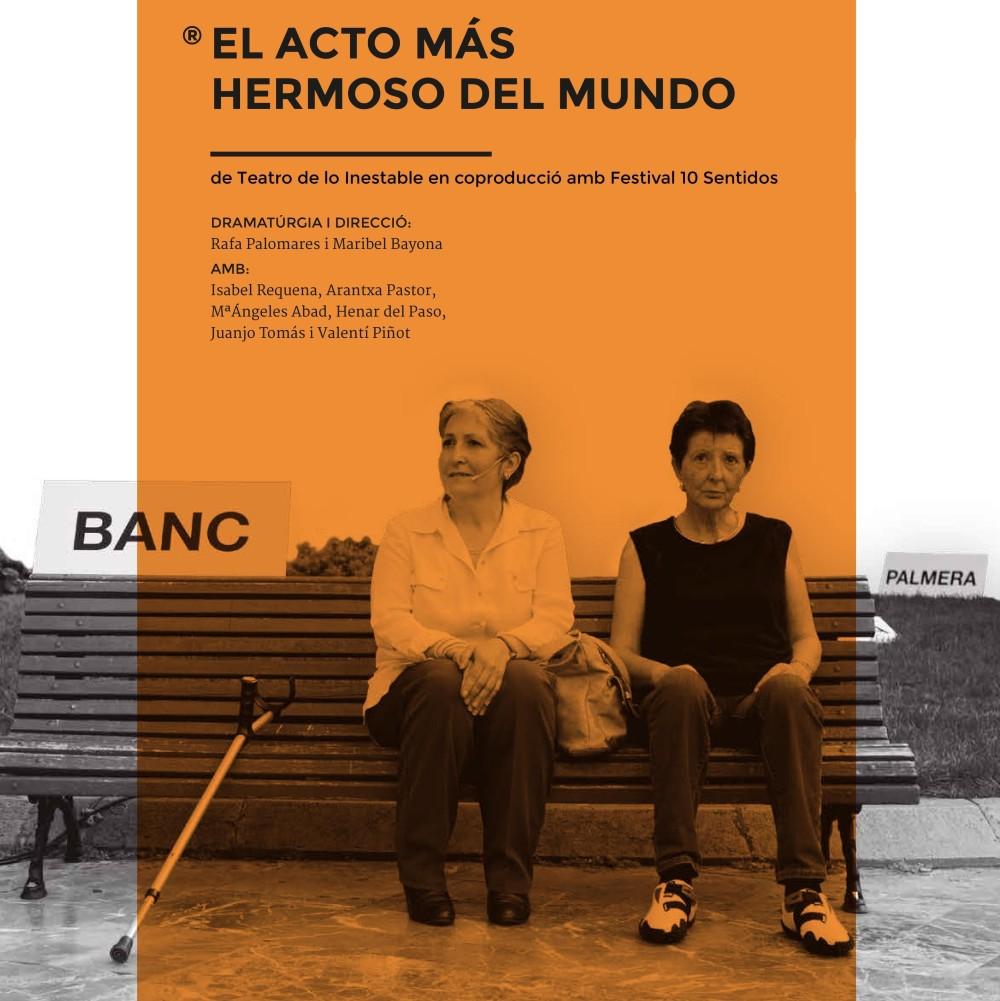 Coincidiendo con la XXV Muestra de Teatre Reclam 2017, la Fundación Caja Castellón programa en la Sala San Miguel 'El acto más hermoso del mundo', una obra de'Teatro de lo Inestable', una compañía con más de treinta creaciones a sus espaldas. La obra es una propuesta escénica en tono poético y testimonial hacia el viaje a la vida sexual placentera en la vejez. Contiene un principio activo de amor por la vida, las personas y el sexo. La representación tendrá lugar a las 19:30 horas. A las 10:30 horas de la mañana la Fundación Caja Castellón y la Concejalía de Gente Mayor del Ayuntamiento de Castellón han programado un pase especial dirigido a 160 personas de colectivos de Gente Mayor de la ciudad de Castellón.