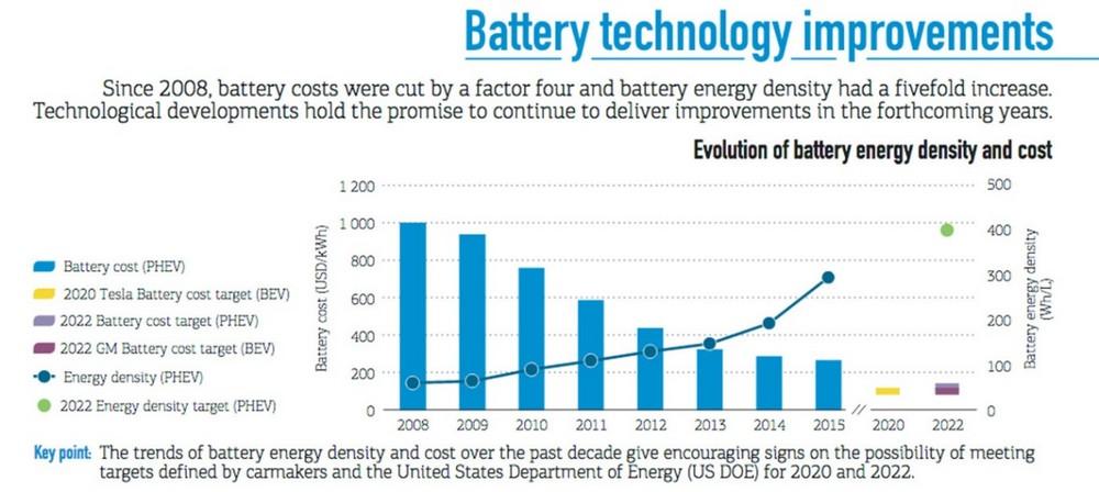 La tecnología en el sector del almacenamiento eléctrico ha conseguido reducir cuatro veces su precio desde 2008 hasta la actualidad y ha conseguido incrementar en cinco veces su densidad energética, datos que se espera mejoren de cara al año 2020 (como se ve en la imagen adjunta).