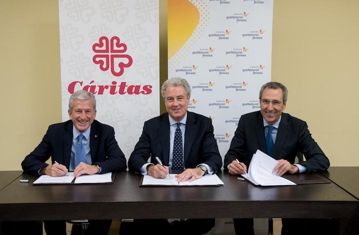 El director general de Comunicación y Relaciones Institucionales de Gas Natural Fenosa, Jordi Garcia Tabernero, el director general de la Fundación Gas Natural Fenosa, Martí Solà, y el presidente de Cáritas, Manuel Bretón, firmaron un convenio de colaboración para ayudar a los colectivos afectados por la vulnerabilidad energética en España.