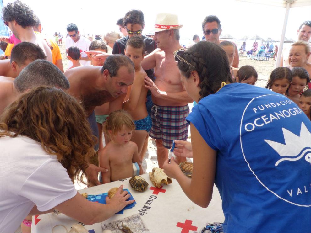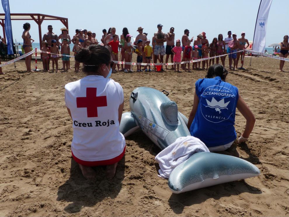 La Fundación Oceanogràfic y la Cruz Roja Española han presentado, hoy lunes 17 de julio en la Playa Romana de Alcocebre, la primera campaña de divulgación por playas de la Comunidad Valenciana dedicada a la red de varamientos de animales marinos. Durante la mañana especialistas de ambas entidades han organizado simulaciones de intervención con cetáceos o tortugas, una exposición de muestras biológicas y entregado información divulgativa a los bañistas de la playa.