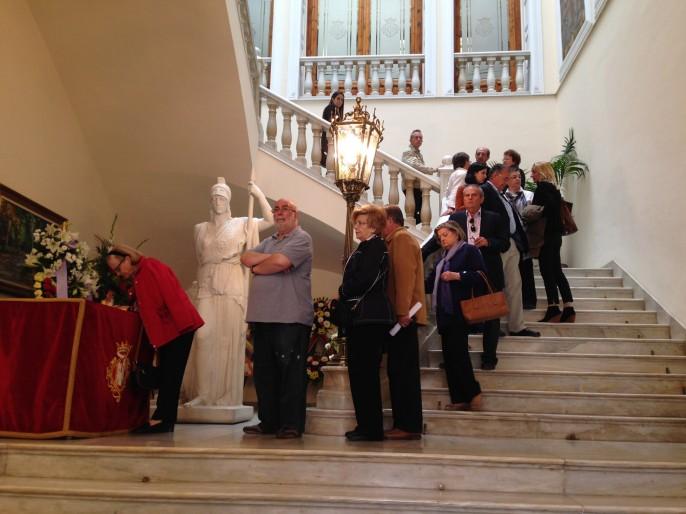 Cuando ayer se difundió la noticia, corrió como un reguero de pólvora por toda la ciudad. Y hoy, esa ciudad se auto convocaba con el corazón en la mano. Una riada de gente por las escaleras del ayuntamiento, esperando su turno para acceder al salón de plenos. Un reguero de gente que todavía miraba con incredulidad a sus familiares, a los que se les escapaban las lágrimas, cuando por fin se acercaban al féretro de Miquel Soler. Y miles de firmas y recuerdos con cariño, para arropar a su familia. Músicos, policías, funcionarios, artistas, políticos, vecinos, festeros.Funerosl Miquel Soler 2V14 (20)
