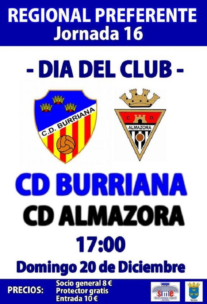 El encuentro que se celebrará el próximo domingo 20 de diciembre a las 17 horas en el Campo San Fernando entre el CD Burriana (5 clasificado) contra CD Almazora (2 clasificado) se ha declarado ‘Día del Club’ por parte de la junta directiva burrianense.