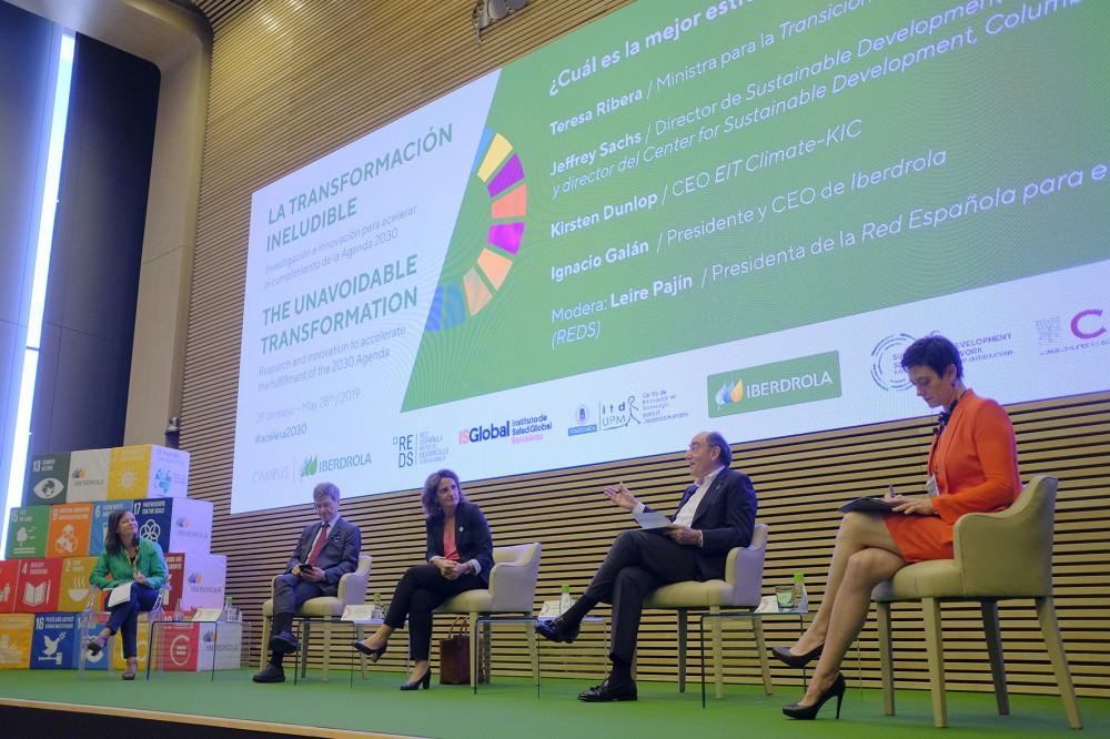 Ignacio Galán, la ministra para la Transición Ecológica en funciones, Teresa Ribera, el asesor especial del Secretario de Naciones Unidas para los Objetivos de Desarrollo Sostenible, Jeffrey Sachs, y la CEO de EIT Climate-KIC, Kirsten Dunlop, han conversado ante un auditorio de unas 300 personas sobre cuál podría ser la mejor estrategia para cumplir los 17 Objetivos de Desarrollo Sostenible (ODS) de la Agenda 2030 de las Naciones Unidas.