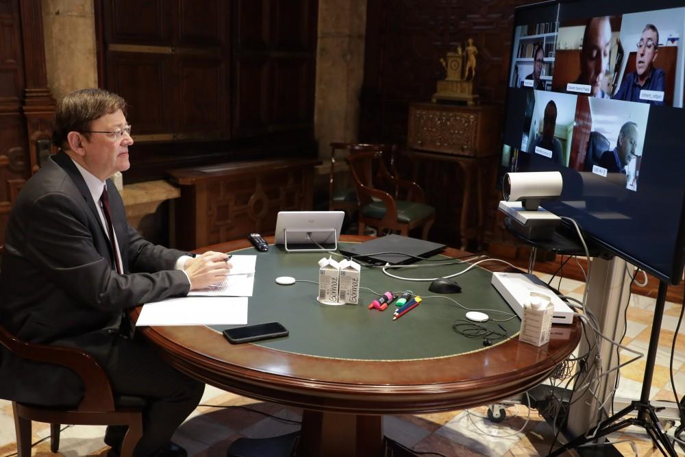 El máximo responsable del Consell ha realizado estas declaraciones tras la reunión por videoconferencia que ha mantenido este jueves con el presidente de la CEV, Salvador Navarro, el secretario general de UGT-PV, Ismael Sáez y el secretario general de CCOO PV, Arturo León, un encuentro en el que también han participado el conseller de Hacienda y Modelo Económico Vicent Soler y el conseller Climent.