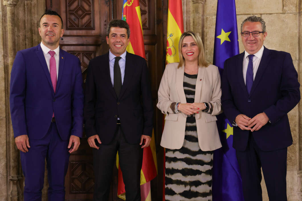 El president de la Generalitat, Carlos Mazón, y los presidentes de las diputaciones provinciales de Alicante, Valencia y Castellón han firmado los acuerdos de cooperación entre la Generalitat y las tres diputaciones provinciales para el fomento de la participación ciudadana, la transparencia y el buen gobierno en el ámbito local a través de la concesión de ayudas a las entidades locales de menos de 20.000 habitantes.