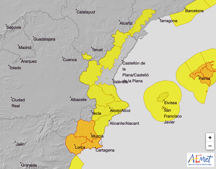 Así pues, estas dos zonas de la provincia de Castellón mantienen su nivel amarillo. En el caso del interior sur de la provincia, se prevén lluvias con una precipitación acumulada en una hora de 20 mm y también, tormentas con granizo.