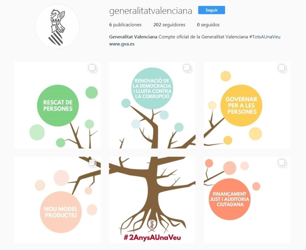 La cuenta, que comenzará a publicar fotografías de manera periódica en el mes de julio, fue puesta en marcha el pasado jueves con motivo del ecuador de la legislatura. El perfil se ha estrenado con un mosaico compuesto por seis imágenes en cada una de las cuales se destaca una selección de los objetivos alcanzados por cada conselleria en el último año de gobierno: una forma visual de trasladar a la ciudadanía el contenido de la rueda de prensa del balance de los 'dos años de cambio'.