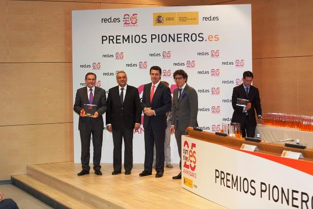 El rector de la Universitat Jaume I, Vicent Climent, ha recogido hoy uno de los premios Pioneros.es, que distinguen a las primeras entidades que crearon páginas web en España. Estos galardones, concedidos por la entidad pública Red.es con motivo del 25 aniversario de la creación de los “.es”, se han entregado en un acto que ha contado con la presencia del ministro de Industria, Energía y Turismo, José Manuel Soria; el secretario de Estado de Telecomunicaciones y para la Sociedad de la Información, Víctor Calvo-Sotelo, y el director general de Red.es, César Miralles.