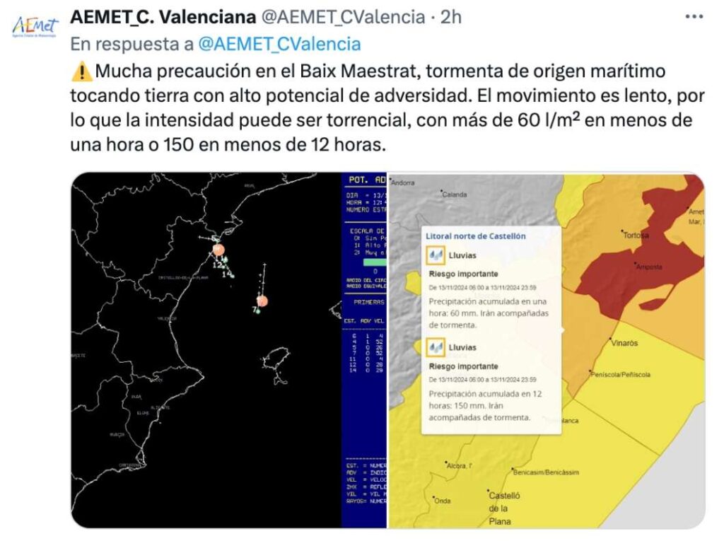 El Consorcio provincial de bomberos ha activado su dispositivo especial por lluvias en el Baix Maestrat, a tenor de las múltiples llamadas recibidas: @BombersDipcas por #lluvias en zona del Baix Maestrat. Bastantes servicios en este momento priorizándose aquellos que requieran rescate de personas.