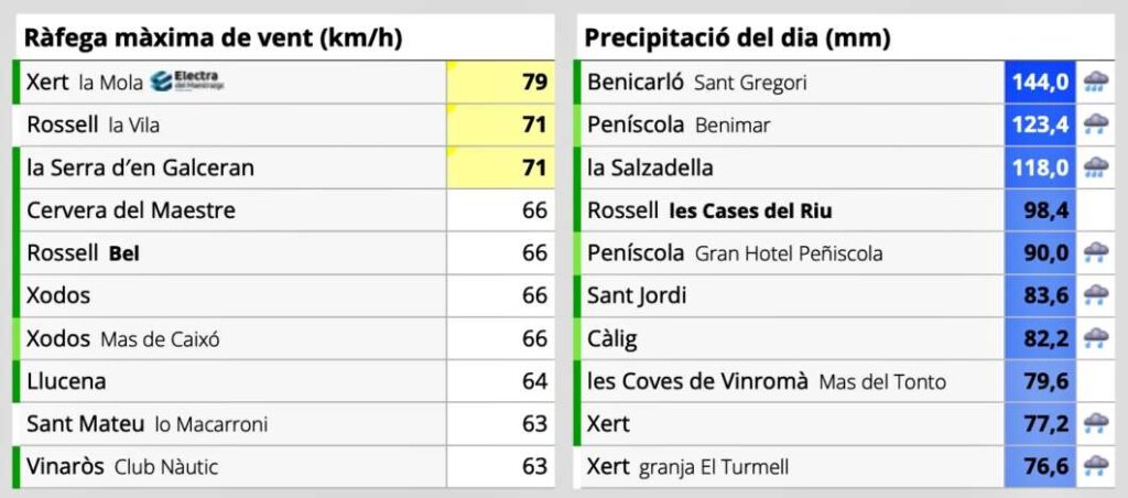 La cantidad de lluvia almacenada a lo largo del día ha arrojado registros de 144 l/m2 en Benicarló, 123,4 l/m2 en Peñíscola; 118 l/m2 en Salzadella, 98,4 l/m2 en Rossell; 98,4 l/m2 en Sant Jordi; 83,6 l/m2 en Cálig; 82,2 l/m2 en Vinaros.