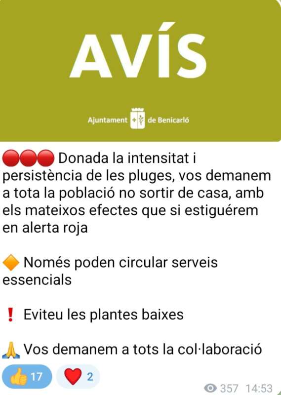 El ayuntamiento de Benicarló ha emitido un aviso a todos los ciudadanos en el que recomienda quedarse en casa por el riesgo de lluvias.