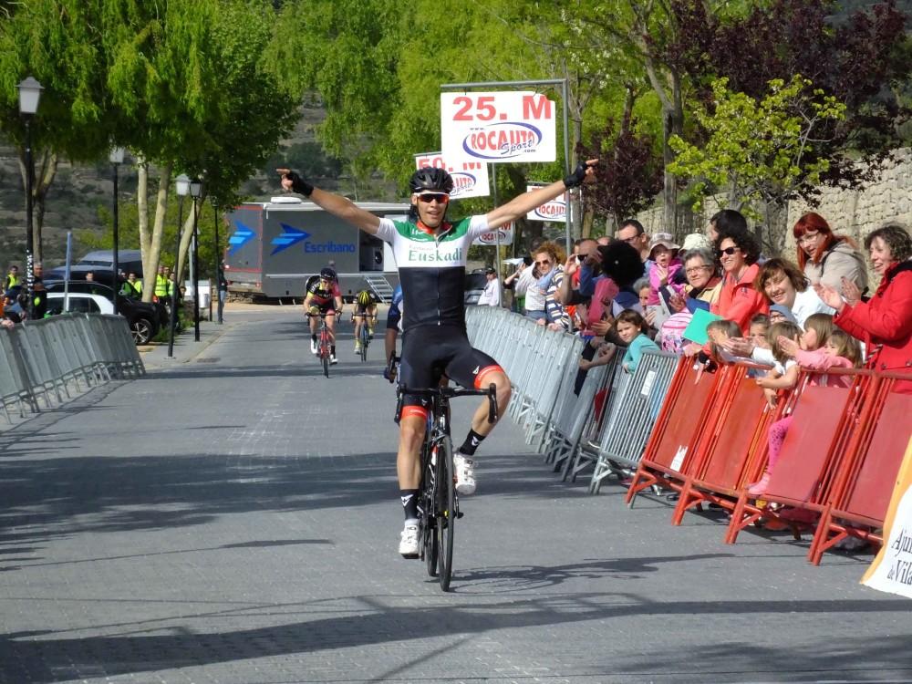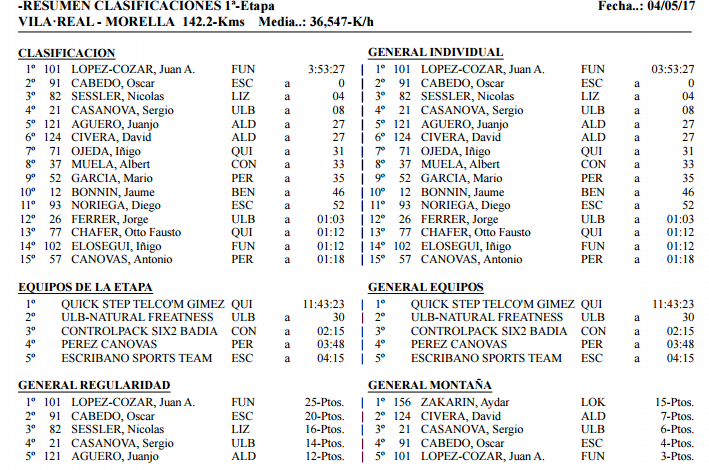En el descenso de este puerto el ruso Zakarin sufrió una caída leve pero que le descolgó de la cabeza de carrera que asumió Civera en solitario marcando un muy buen ritmo que le permitió aumentar la distancia sobre el grupo perseguidor donde los Escribano intentaban dar caza, pero no había mucho acuerdo. Civera llegó a tener 1’ 20” de ventaja, pero a falta de 3 kilómetros la distancia se había reducido a los 45”. Por detrás los perseguidores persistían en su empeño y un grupo de cuatro corredores dio el salto a por la cabeza de carrera. A falta de un kilómetro para meta, entrando en el casco urbano de Morella por la puerta de Sant Mateu, le alcanzaron y se jugaron la etapa en la última rampa que acaba en la meta. Allí fue donde López-Cozar se adjudicó esta emocionante primera jornada y el mallot de líder que patrocina el Ayuntamiento de Vila-real desde el Servei Municipal d’esports.