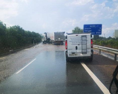 Además, se ha producido un accidente en la A-23 con sentido Teruel entre dos camiones a la altura de Soneja, donde la fuerte lluvia dificulta la visión (Foto de portada. Abel Rivas).