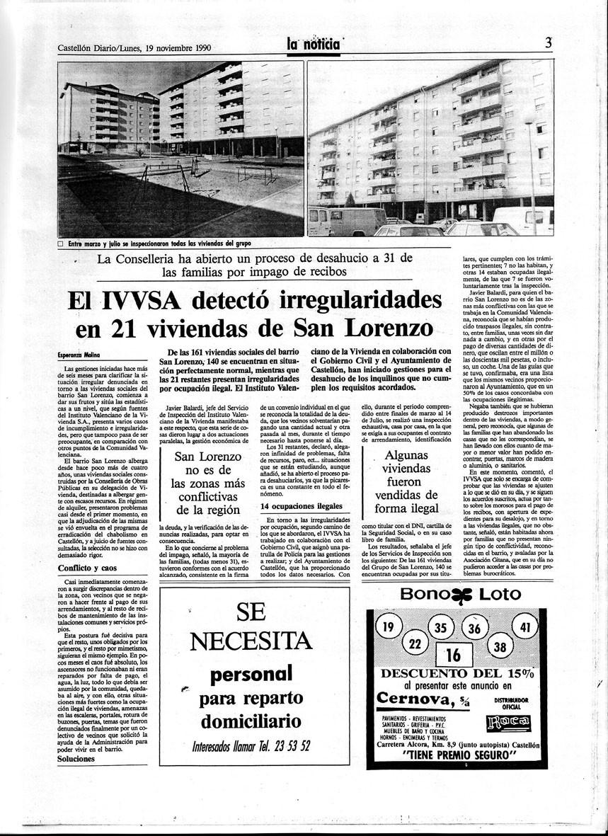 En noviembre de 1990, el IVVSA anunció que había detectado irregularidades en 21 viviendas de San Lorenzo. Se estableció entonces un proceso destinado a: reordenar y regularizar el Grupo: detectar las viviendas ilegalmente transferidas u ocupadas; rehabilitación de inmuebles y renegociación con los vecinos para establecer una situación de ‘normalidad’ y ‘convivencia’. Este proceso coincidió también con el desarrollo del ‘Proyecto Urban Castellón’