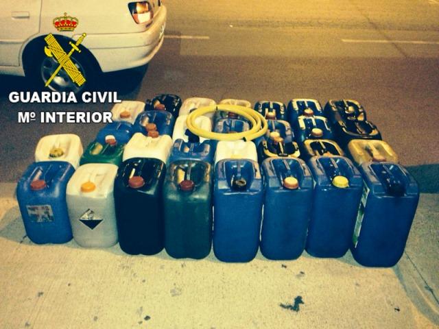 Inmediatamente los guardias civiles se desplazaron al lugar del hecho, y tras realizar un exhaustivo reconocimiento de la zona, observaron que tras la valla que protege la vía, se encontraban escondidas 8 garrafas de gasoil de 25 litros cada una y en un campo muy cercano 22 garrafas de  30, 20 y 25 litros junto con una manguera de 2 metros de longitud.