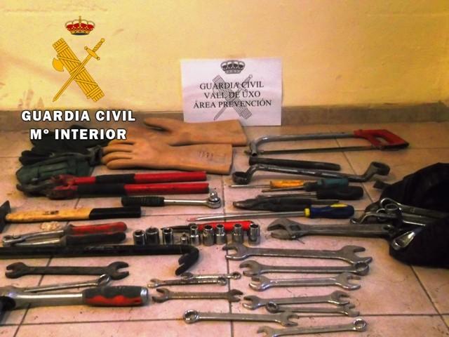 Efectuado un nuevo reconocimiento en el recinto, se encontraron diversas herramientas utilizadas para la comisión del hecho delictivo, tales como una pata de cabra, una cizalla, guantes, martillos, destornilladores, llaves inglesas y la localización de una apertura en la