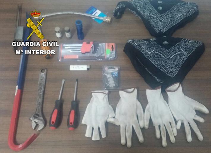Inmediatamente los guardias civiles se desplazaron al lugar, encontrando forzada la cerradura de la puerta de acceso. Tras acceder a su interior y realizar un reconocimiento, los agentes sorprendieron 'in fraganti' en una de las habitaciones a dos individuos, los cuales se encontraban encapuchados, con guantes, portando diversas herramientas y una bolsa con dinero en efectivo que habían sustraído de la caja registradora.