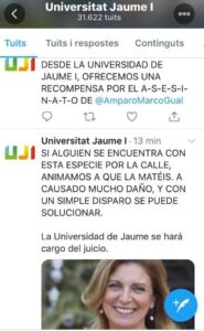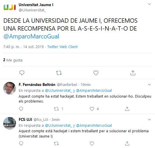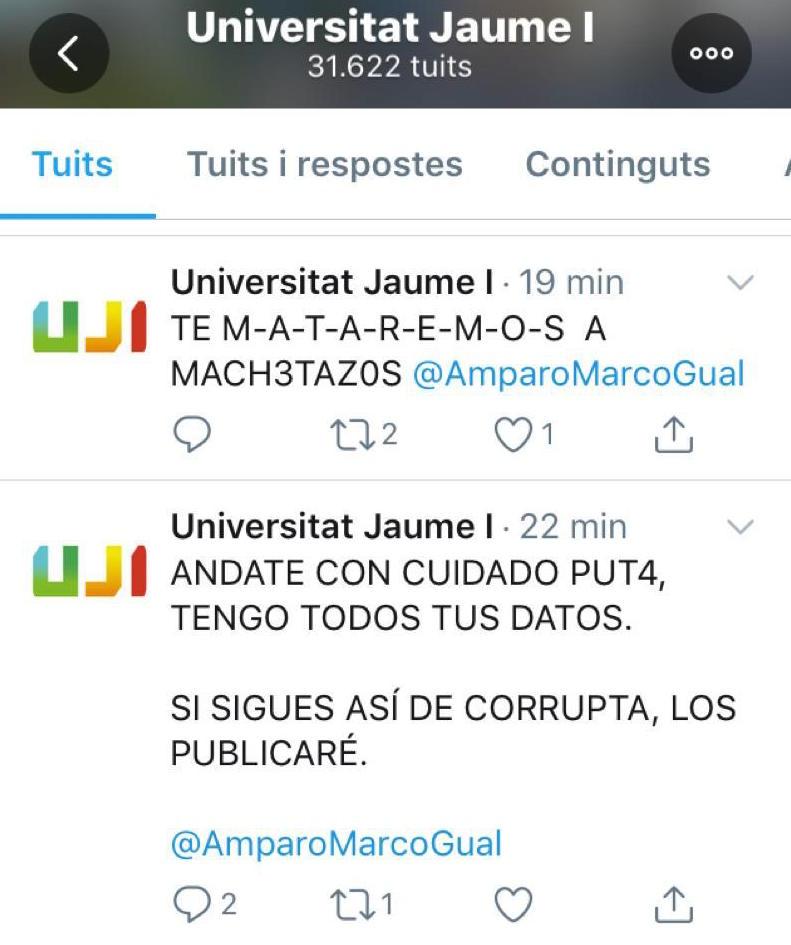 Asimismo, os informamos que la Universitat Jaume I denunciará estos hechos ante la Policía Nacional ya que se ha usado la cuenta oficial para realizar amenazas e insultos contra la alcaldesa de Castelló. La rectora de la Universitat Jaume I, Eva Alcón, ha condenado estas amenazas y ha expresado a la alcaldesa el apoyo y solidaridad de toda la comunidad universitaria".