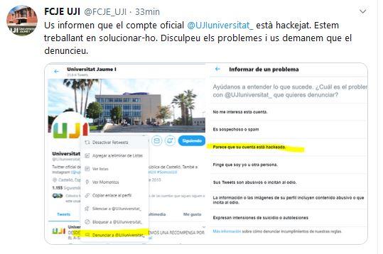 A través del Facebook de la universidad, también se ha dado aviso de lo que ocurre con la cuenta de la UJI y se ha solicitado la colaboración universitaria para denunciar la incidencia a Twitter