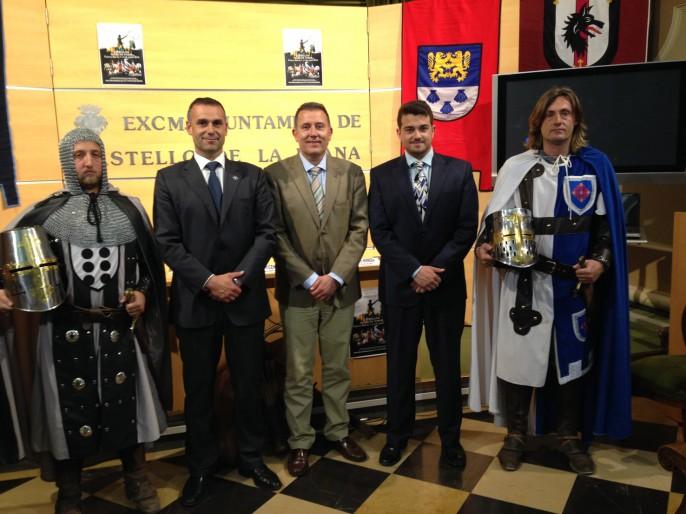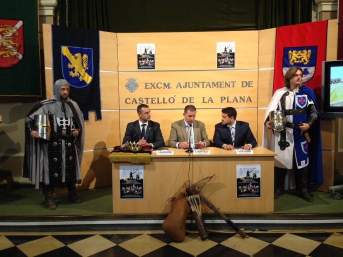 El “Torneo del Rey”, que se representará en Castellón los días 6, 7 y 8 de junio, ha sido presentado esta mañana en una rueda de prensa, que también ha sido excepcional. Junto a los organizadores y el concejal de Cultura, Vicent Sales, dos caballeros del Rey, con todos sus emblemas, heráldica y leyendas, reproducción de lo que fueron los originales.