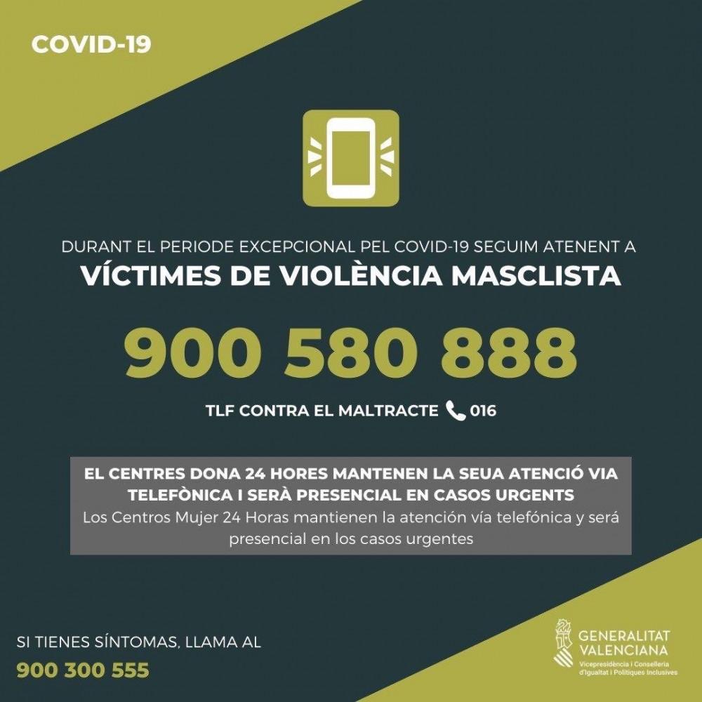 El consistorio recuerda que las víctimas de violencia machista tienen a su disposición el teléfono 900 580 888 durante el periodo excepcional por el coronavirus, además del 016. El Ayuntamiento de Almassora tiene activo el plan Viogen para el seguimiento de las víctimas y el programa Juntes de reinserción social, con la colaboración de Cruz Roja.