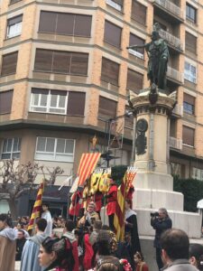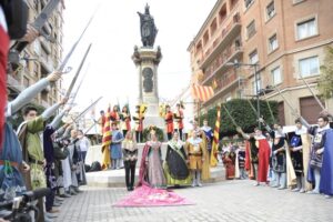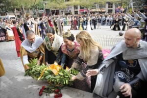 La estatua, obra del escultor Viciano, ha sido testigo un año más de la ofrenda que ha comenzado con la entrega de la rosa caballeresca a los pies del monumento por las Dones de Companya quienes han ido depositando la flor en este orden: Lorena Segarra (Na Dolça), Sara Renau (Na Eva), Estela Bastida (Na Margarida), Balma Porcar (Na Provençala), María Grifo (Na Rama) y Patricia Guarque (Na Enmengarda).