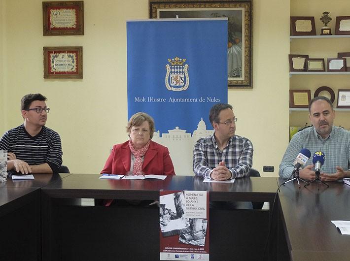 La localidad Nules vivirá este fin de semana la rememoración de los 80 años de la Guerra Civil en su término municipal con el ciclo de conferencias ‘Homenatge a Nules. 80 anys de la Guerra Civil’, que ha sido presentado esta mañana en rueda de prensa por parte del concejal de Cultura de Nules, Ramon Canut; la Coordinadora del Grup d’Estudis d’Història Local i Fons Orals de la Universitat Jaume I, Rosa Monlleó; el doctorando David Oliver Expósito, miembro de este grupo de estudios; y el comisario de la exposición Vicente de Haro, que estará presente en la Sala de Exposiciones de la Biblioteca Municipal desde este viernes hasta el próximo domingo 15 de mayo.