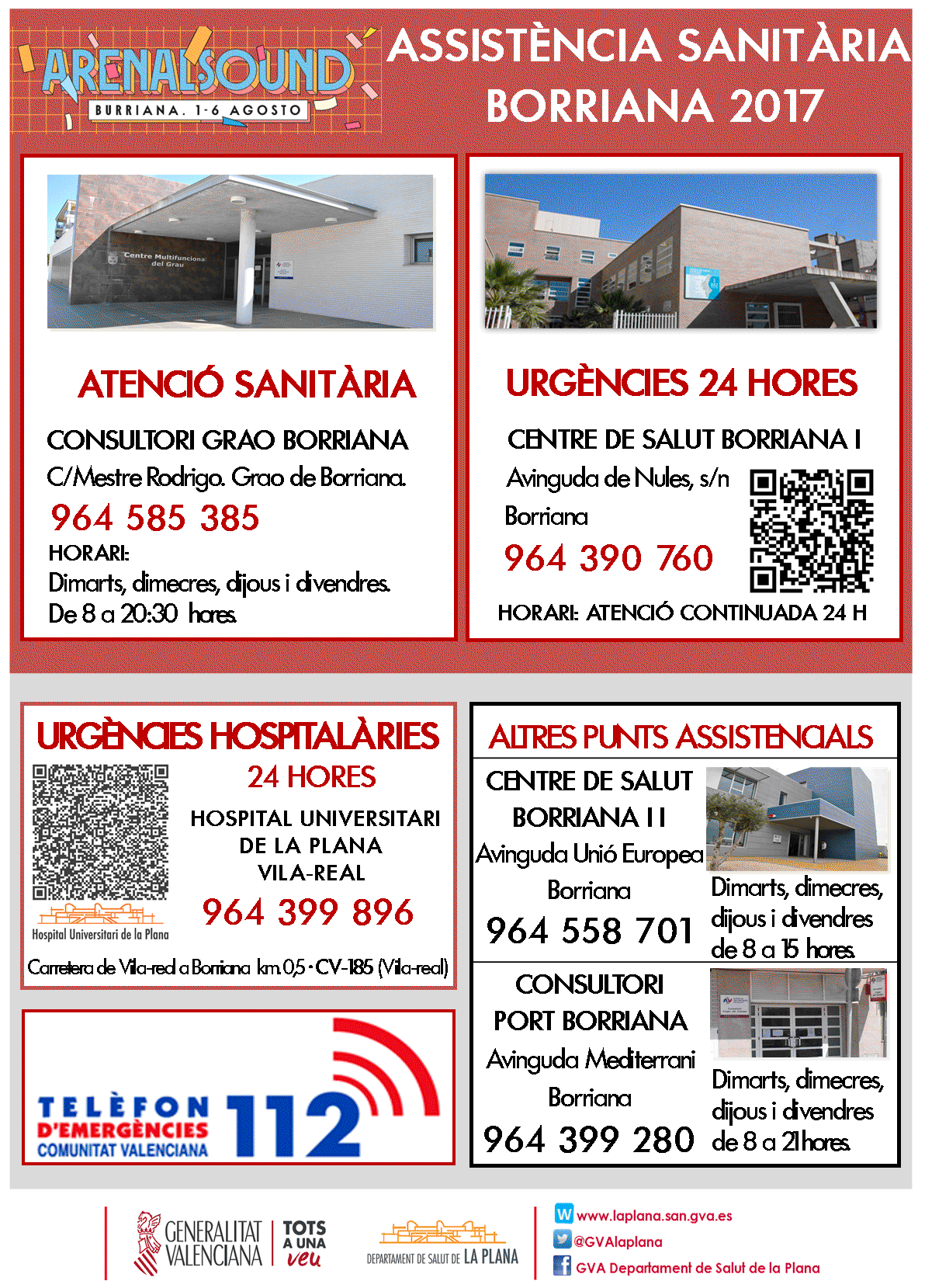 El Departamento de Salud de la Plana ha reforzado los recursos asistenciales tanto en el municipio de Burriana como en el Hospital Universitario de Vila-real con el objetivo de garantizar la atención sanitaria durante los días de celebración del festival Arenal Sound, que tendrá lugar entre el 1 y el 6 de agosto de 2017. De esta forma, la asistencia 24 horas se atenderá en el punto de atención continuada del centro de salud Burriana I, ubicado en la avenida de Nules del municipio, durante toda la semana del festival musical.