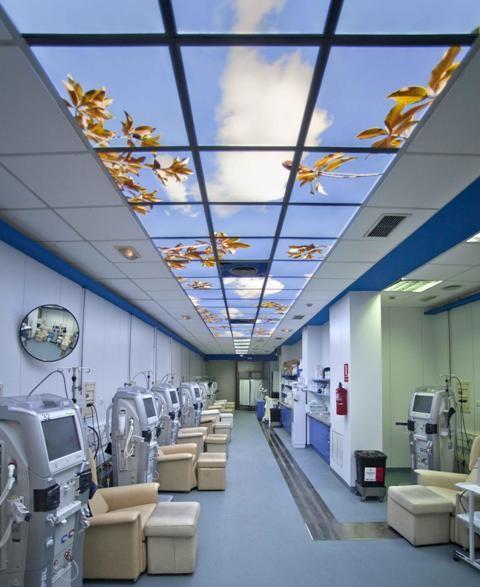 Los pacientes del servicio ven desde que entran fotografías, realizadas ad hoc por el fotógrafo Andrés Hernández Zuazo para Hospitales Nisa, de hojas frescas colgadas sobre una pared verde que envuelve el espacio. En la sala de espera principal, un gran mural les hace sentir dentro de un bosque. Y una vez entran dentro de la sala de tratamiento, en la que pasan una media de 5 horas tres días a la semana, el techo se ha convertido en un tragaluz luminoso retroiluminado con luces LED, con reproducciones fotográficas de cielos, ramas de árboles y flores que aparecen y desaparecen y que transmiten el color, la profundidad y la perspectiva de un cielo real, para que la sensación sea la de estar recostado en un prado.