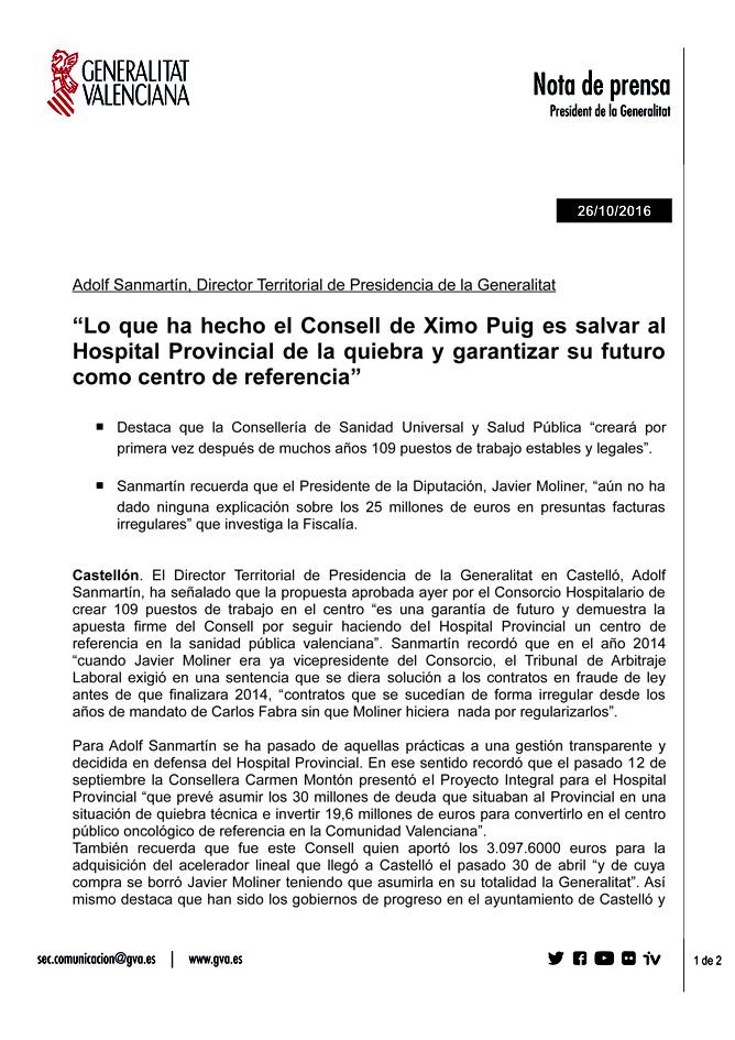 En último lugar, esta información recoge también la nota de prensa remitida hoy por la delegación de la Generalitat en Castellón, que reitera lo que dijo ayer la consellera Carmen Montón sobre el Hospital Provincial, pero en boca de Adolf Sanmartín, director Territorial de Presidencia de la Generalitat.