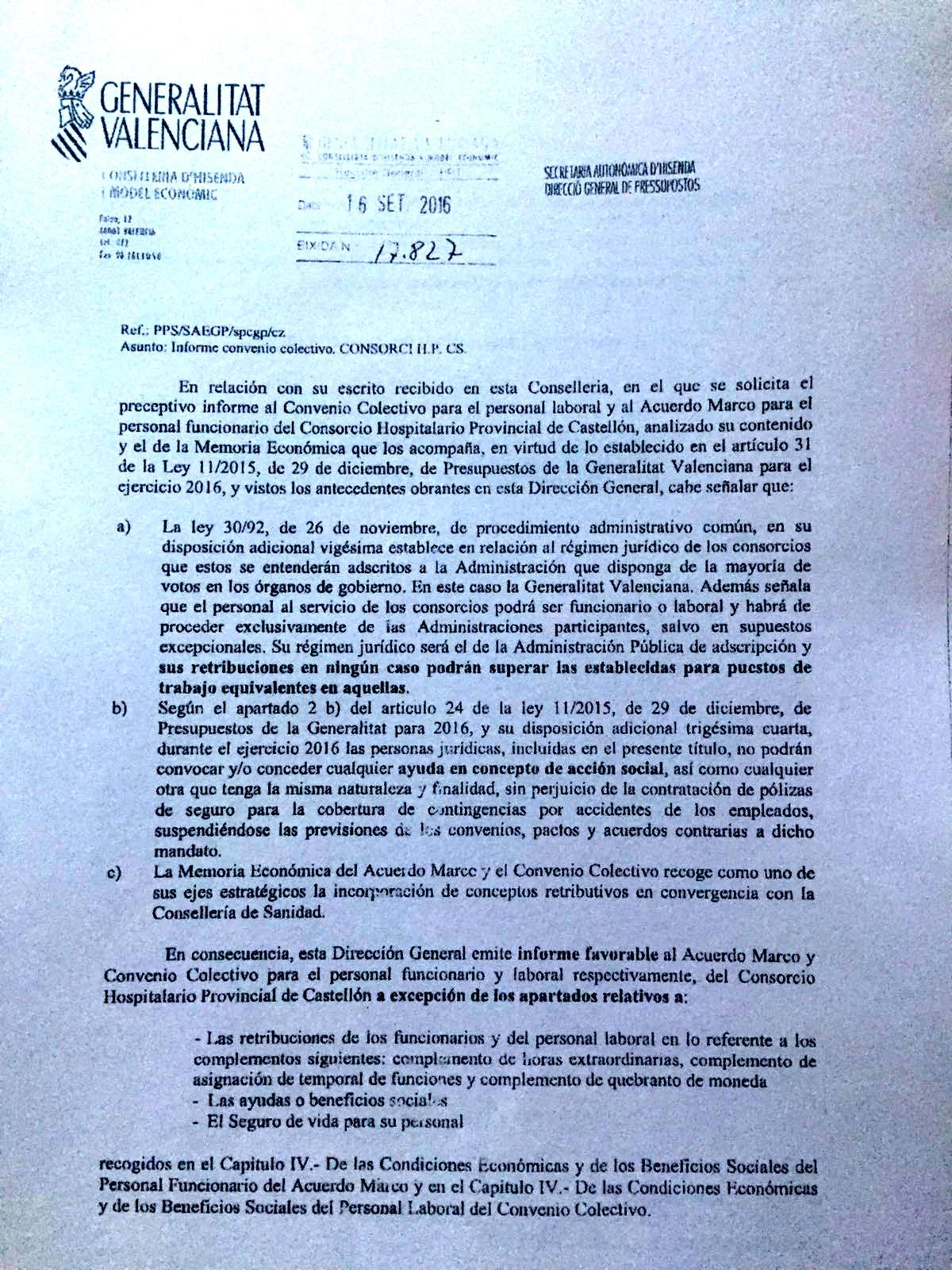Y añade: “En consecuencia, esta Dirección General emite informe favorable al Acuerdo Marco y Convenio Colectivo para el personal funcionario y laboral respectivamente, del Consorcio Hospitalario Provincial de Castellón a excepción de los apartados relativos a: