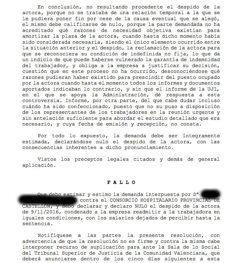 El Juzgado de lo Social ha estimado la primera de las demandas que se presentaron como consecuencia de los 17 despidos aprobados por la consellera de Sanidad el pasado 25 de octubre, y ha declarado nulo ‘el cese’ de la trabajadora, que deberá ser readmitida en su puesto de trabajo además de recibir las mensualidades salariales que dejó de cobrar desde que se le notificó que no seguiría ejerciendo sus labores profesionales.