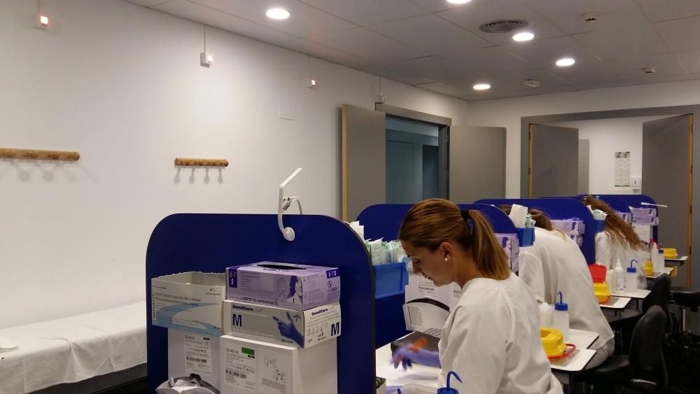 En la sala de espera se ha instalado una pantalla que indica a los pacientes a qué box deben dirigirse para que se le efectúe la extracción en el momento en que un puesto queda libre.