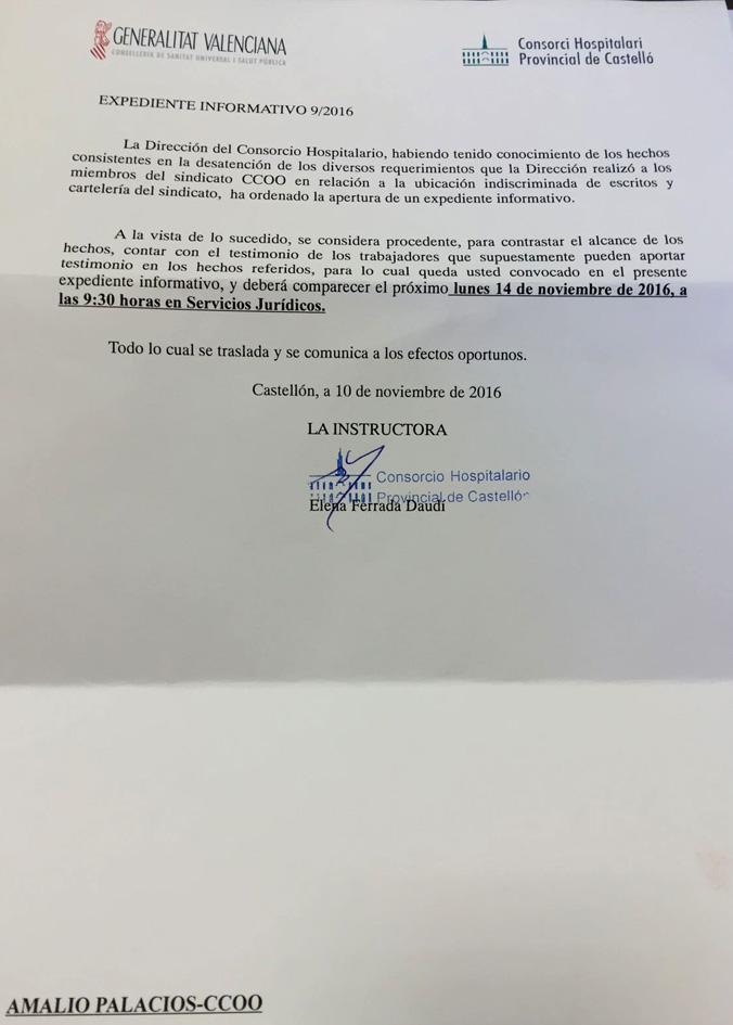 "La Dirección del Hospital Provincial insta la apertura de un expediente informativo al sindicato CCOO por la utilización de cartelería en el ejercicio de la reivindicación de derechos y del empleo público en el Hospital Provincial de Castellón, en un intento de acallar voces molestas y de allanarse el camino para el desarrollo de su hoja de ruta sin inconveniencias