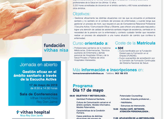 El próximo 17 de mayo, el salón de actos del Hospital Vithas Nisa Rey Don Jaime acogerá la jornada en abierto "Gestión eficaz en el ámbito sanitario a través de la Escucha Activa" que tendrá lugar de 8:30 a 14:30 horas y que será impartido por Elena Ariste Mur, miembro de la Asociación Británica de Counselling & Psychotherapy (BACP) con más de 3.220 horas acreditadas de docencia en el ámbito sanitario