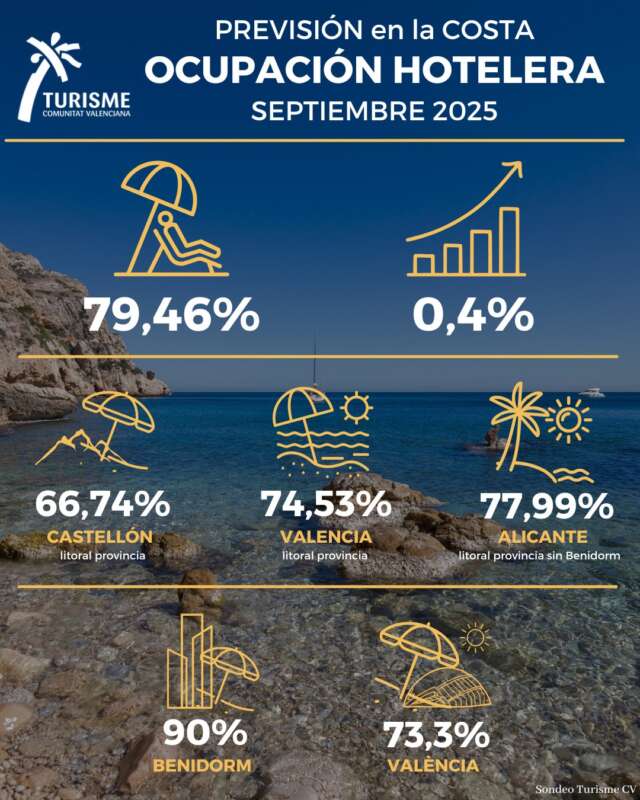 Los hoteles del litoral de la Comunitat Valenciana cuentan en estos momentos con unas reservas para este mes de septiembre del 79,46 %, 0,4 puntos superior al mismo mes de 2024. Así se desprende del sondeo realizado por Turisme Comunitat Valenciana a una muestra representativa de hoteles de las tres provincias, con unas cifras de reservas que se espera que sigan aumentando en los próximos días.