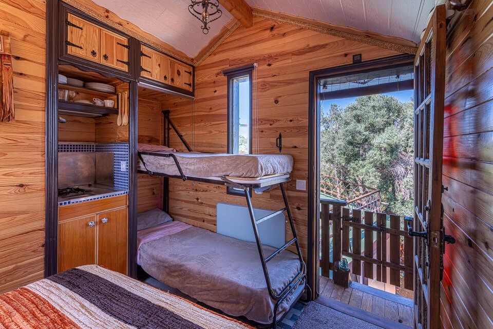El primero de ellos es la casa árbol, emplazada en los ‘brazos’ de un viejo algarrobo centenario; ideal para divisar el cielo estrellado. Este particular hotel también ofrece al huésped la posibilidad de dormir en una cabaña en forma de triángulo, un espacio único, artístico y muy acogedor, pues su interior está construido con tablones y grandes troncos de madera y desde sus cristaleras triangulares se divisa el mar Mediterráneo.