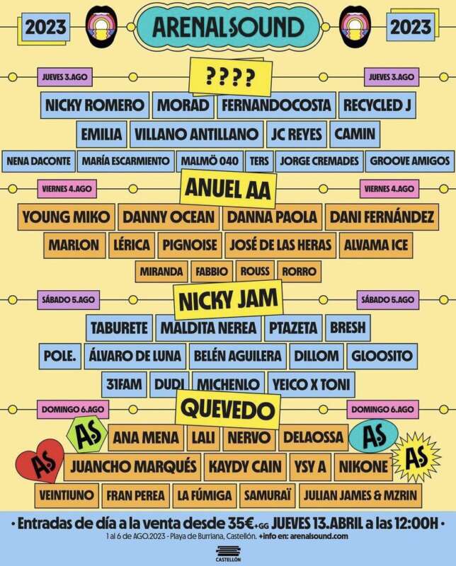 Anuel AA, Nicky Jam, Quevedo, Morad, Danny Ocean, Fernandocosta, Young Miko, Nicky Romero, Ana Mena, Emilia, Lali, Delaossa, Kaydy Cain, Maldita Nerea, Belén Aguilera, Álvaro de Luna o Villano Antillano, son algunos de los famosos artistas que estarán en la próxima edición del Arenal Sound.