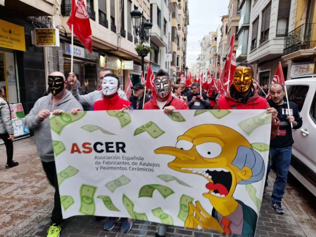 Trabajadores del sector cerámico se han manifestado este viernes por el centro de Castelló para mostrar su rechazo ante lo que califican de ‘bloqueo por parte de Ascer’ en la negociación del convenio colectivo. La protesta ha partido desde la plaza de Las Aulas para recorrer las vías más céntricas de la ciudad y llegar hasta la sede de la Asociación Española de Fabricantes de Azulejos y Pavimentos Cerámicos (Ascer).