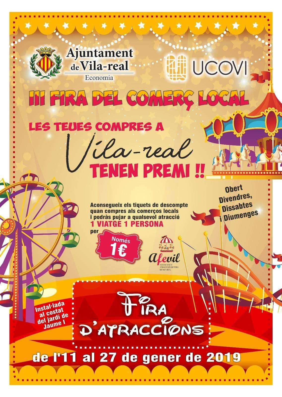 Vila-real tornarà a comptar, des del divendres 11 i fins al 27 de gener, amb una fira d'atraccions per a la promoció del comerç local en l'època de rebaixes. La fira, que s'instal·larà al jardí de Jaume I, estarà operativa només els caps de setmana (divendres, dissabtes i diumenges de gener) i distribuirà entre els comerços de la ciutat 8.000 tiquets amb descomptes per a les atraccions. La iniciativa està impulsada per la Regidoria d'Economia, en col·laboració amb la Unió de Comerç de Vila-real (Ucovi) i l'Associació de Firaires de Vila-real (Afevil).