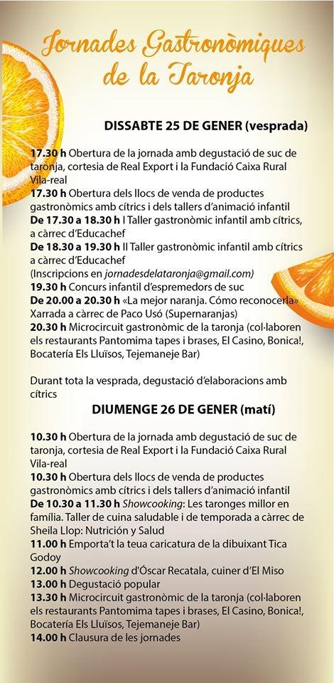 A la mateixa hora s'inauguraran els estands de venda de productes cítrics amb els tallers gastronòmics infantils a càrrec d’Educachef, i a les 19.30 hores es realitzarà el divertit concurs infantil d'espremedores de suc. A les 20.00 hores tindrà lloc la xarrada, oferida per Paco Usó sota el títol de 'Supernaranjas', per a aprendre a identificar la millor taronja de temporada, i la jornada del dissabte finalitzarà amb un microcircuit gastronòmic de tapes de taronja pels restaurants pròxims com Pantomima Tapes i Brases, El Casino, Bonica!, Bocatería Els Lluïsos i Tejemaneje Bar.
