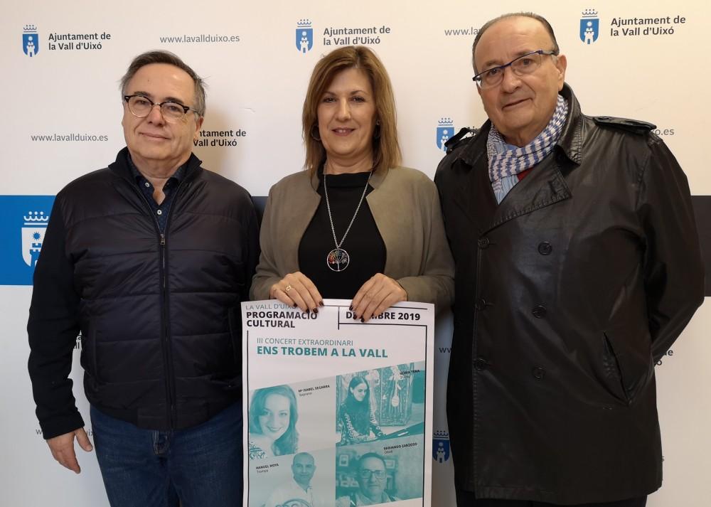 El Ayuntamiento de la Vall d'Uixó y Joventuts Musicals presentan la tercera edición del Concierto Extraordinario 'Ens trobem a la Vall', que se celebrará el sábado 28 de diciembre a las 20.00 horas en la Església Mare de Déu de l'Assumpció. La entrada es totalmente gratuita aunque el aforo es limitado. Este año el concierto estará formado por un cuarteto de piano, oboe, trompa y voz.